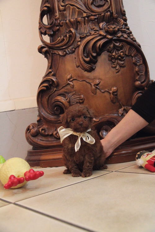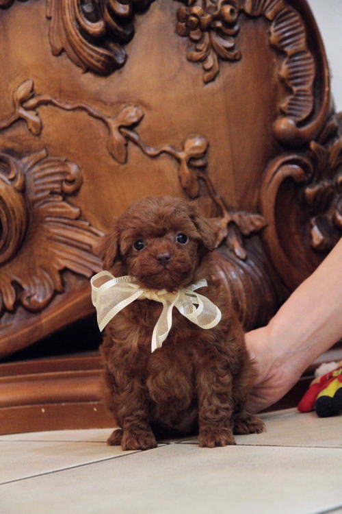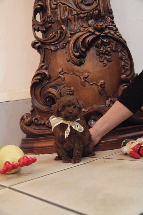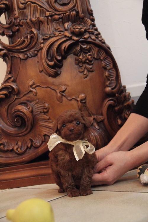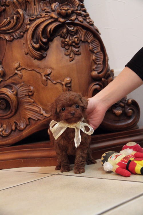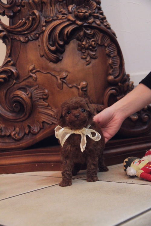 ★ティーカップサイズの男の子★ 成犬時の予想サイズが1.5kg位の小さなティーカップサイズの男の子です。 こちらの子は、とても可愛い子なのですが、鼻の色素が薄く、レバーな為(レバーと言ってもピンクでは無く、チョコレート色)通常価格よりお値段を引き下げております。月齢が浅いうちでの撮影となった為、まだこれから、少しずつ濃くなりますが、こげ茶色の鼻と想像頂ければと思います。 健康上や生活上には一切支障も無いのでご安心頂ければと思います。 あまりにも可愛いので、みんなメロメロになっています。 顔もだし、仕草もだし、なんと言うか、愛嬌いっぱいで尻尾フリフリと。 レッドの色味がとても濃い子で、毛量はティーカップサイズとは思えない密度あります。 1回目のワクチン接種と健康診断が終わっており、すぐに引き渡しが可能です。 飼育の事やトリミングの事など、ご不安な点も、子犬の購入後の手続きの際に一つずつ丁寧にご指導いたしております。 ご安心して、お気軽にお問い合わせ下さいませ。 表示価格は現金特価となっております。 カードでお支払いのお客様は283,500円(税抜262,500円)でございます。 当社で飼育の際に実際に使用しているゲージやトイレなどの生活用品の一式がセットになって37,800円の飼育セットの御用意がございます。 犬種ごとに選択いただくゲージも違いますので、初めての方は、ワンちゃんの購入の際に、同時に飼育セットをお持ち帰りいただく事をオススメしております。 ワンちゃんも使い慣れているので、不安無く新しい生活がスタート出来ると思います。 |