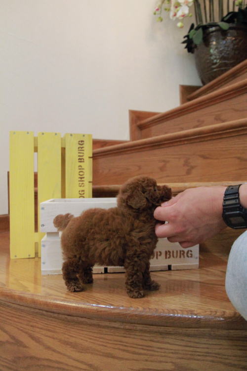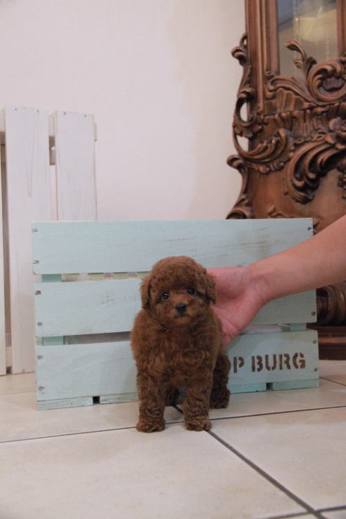 ★ディープレッドのティーカップちゃん★ 成犬時の予想サイズが1.8kg位のティーカップサイズに仕上がりそうです。 顔が丸顔でとっても可愛くて、目がクリクリしていて大きく、マズルがとても詰まっている子です。 体型も真ん丸くズングリムックリとしていて可愛らしい形をしています。 毛色がかなり濃いディープレッドで、毛量は素晴らしく抜群にあります。 月齢の近い「きららの息子」とよく遊んでいます。 お互いに優しい性格で仲良く過ごしています。 1回目のワクチン接種と健康診断後の6月23日よりお引き渡しが可能です。 飼育の事やトリミングの事など、ご不安な点も、子犬の購入後の手続きの際に一つずつ丁寧にご指導いたしております。 ご安心して、お気軽にお問い合わせ下さいませ。 表示価格は現金特価となっております。 カードでお支払いのお客様は750,750円(税抜682,500円)でございます。 当社で飼育の際に実際に使用しているゲージやトイレなどの生活用品の一式がセットになって37,800円の飼育セットの御用意がございます。 犬種ごとに選択いただくゲージも違いますので、初めての方は、ワンちゃんの購入の際に、同時に飼育セットをお持ち帰りいただく事をオススメしております。 ワンちゃんも使い慣れているので、不安無く新しい生活がスタート出来ると思います。 |